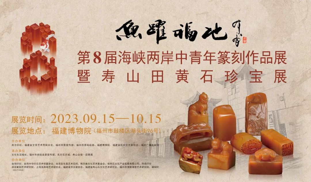 福凝篆艺瑞气呈,鱼入金石秋韵浓。由西泠印社、福建省文学艺术界联合会、福州市委宣传部、福州市委统战部、福建博物院、福建省民间文艺家协会、福州广播电视台等单位主办,文化生活报社、福州市闽侯县委宣传部、东方石艺城、寿山会馆·田黄阁等单位承办的“鱼跃福地”第八届海峡两岸中青年篆刻大赛作品展暨寿山田黄石珍宝展于2023年9月15日—2023年10月31日在福建博物院展出。同时,展览从福建博物院出发,于2023年11月16日-2023年12月14日于西安巡展,并于2023年12月4日-2023年12月15日于台湾巡展。