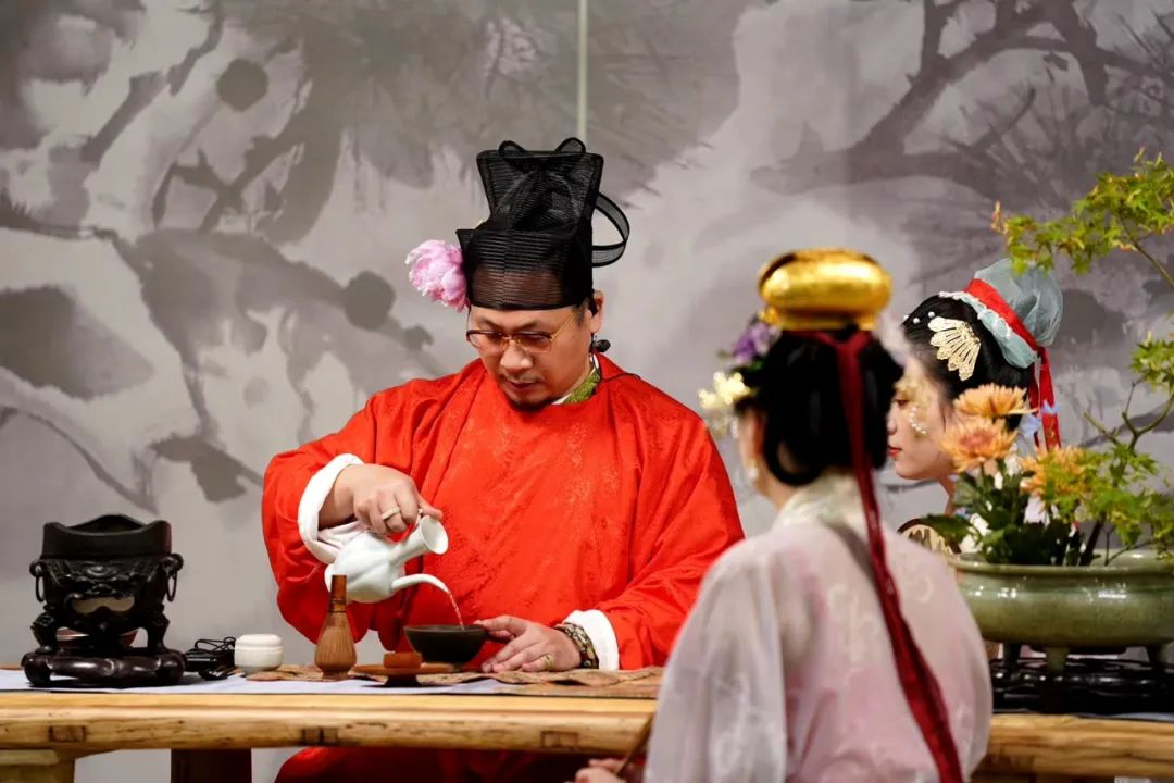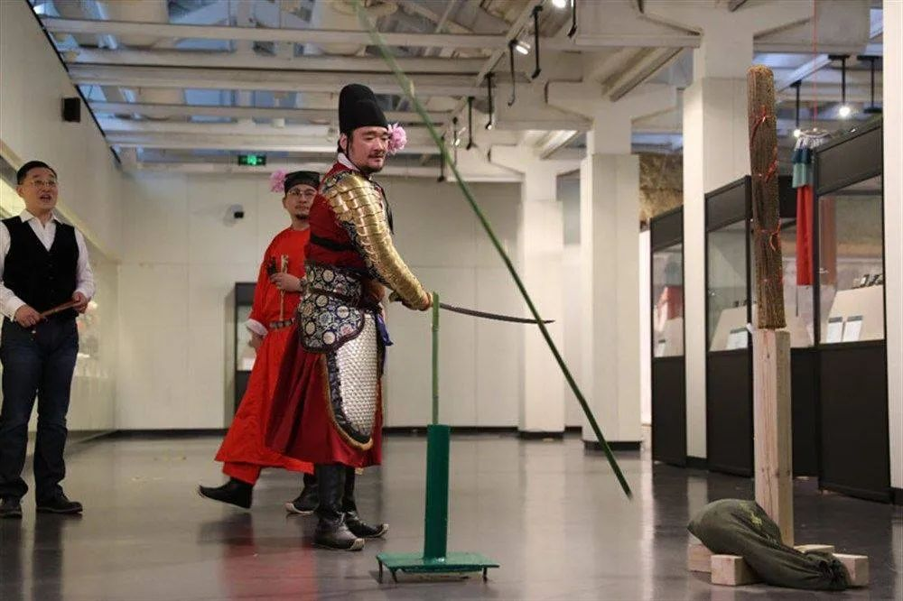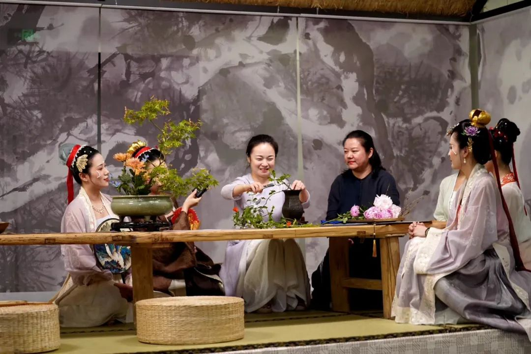 下午1:30,在韩天衡美术馆艺术总监韩回之的主持下,根据布展的设计思路,按照宋代士人的一日之迹展开。在“闻鸡起舞”环节,由武学家郑鸣冲和顾祎在冷兵器展柜前介绍了宋代典型兵器的流传、演变、制造,以及战场上的用途。在“暖炉点茶”环节,韩回之与国家高级评茶员黄敏用宋代建盏现场还原了点茶的过程,介绍了展柜中各地烧制的宋代茶盏名品。之后的“撷芳插花”和“投壶寻礼”等环节中,根据古典诗词及古画中所描绘的插花投壶进行了现场互动。