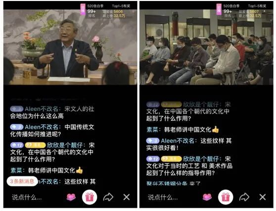 在直播后半段,由81岁高龄的著名艺术家韩天衡先生带来《回眸两宋——精选展品赏析》。韩先生以展品中最具重量级和代表性的《绍圣元年修内司制鲍照〈梅花落〉双钩诗文白玉勒》、《剔黑凤穿牡丹漆盒》和《三彩竹节牡丹蹴鞠纹暖砚》为例,介绍了宋代文人的阶层和审美特点。课上,不断有观众弹幕互动,在评论区积极讨论提问。